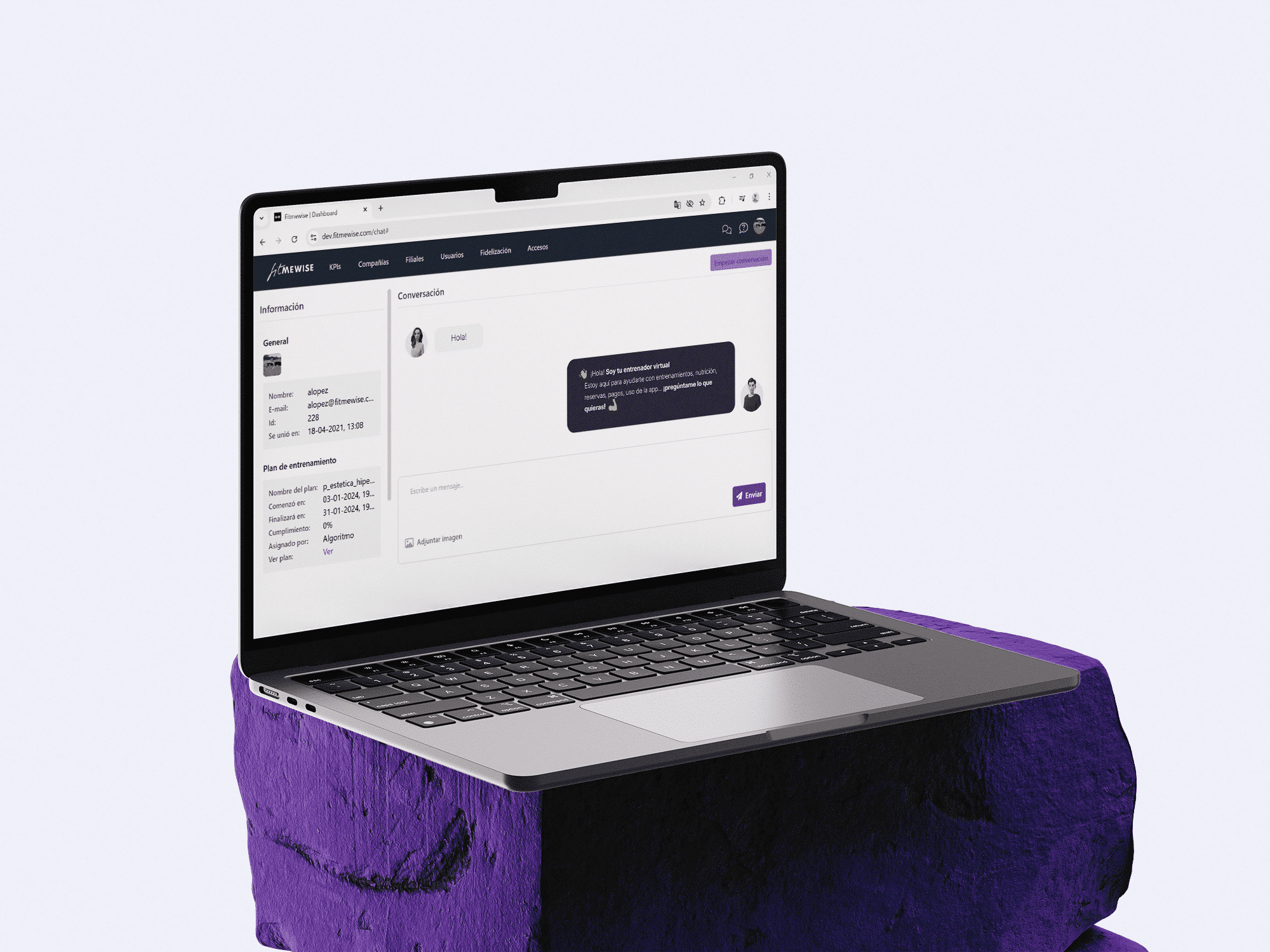 Chat Sistema de mensajería directa entre usuarios y personal del centro. Con asistentes automáticos e IA para respuestas frecuentes y filtrado de conversaciones. ¿Qué permite hacer? Comunicación 1:1 o por rol (cliente ↔ staff)Historial completo y trazado por clienteAutomatizar respuestas o rutas de derivaciónIntegración con tareas o seguimiento Ver tutorial ¿Cómo se usa? Desde el dashboard (admin) Ver conversaciones, responder o delegarActivar respuestas IA o manuales ¿Cómo se usa? Desde la app (cliente) Escribir consultas, recibir soporteAcceder a histórico y notificaciones de respuesta