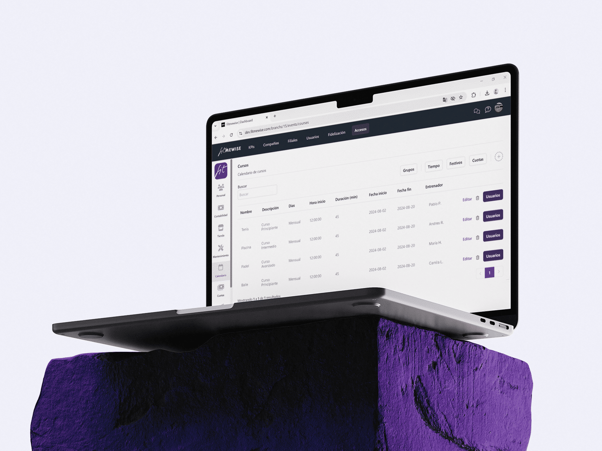 Cursos Módulo para crear y gestionar programas formativos estructurados por sesiones, fases, evaluaciones y cuotas específicas. Ideal para formaciones, certificaciones, escuelas internas. ¿Qué permite hacer? Crear cursos con fechas, sesiones y fasesAsignar instructores, espacios y evaluacionesAsociar cuotas exclusivas por cursoEmitir certificados, llevar progreso y asistencia Ver tutorial ¿Cómo se usa? Desde el dashboard (admin) Crear estructura, asignar alumnos, controlar progreso ¿Cómo se usa? Desde la app (cliente) Ver calendario, evaluaciones, notas y pagos asociados