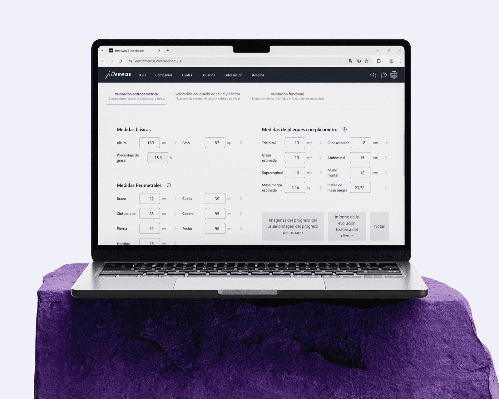 Módulo central para la evaluación, el seguimiento y la evolución del cliente a nivel antropométrico, funcional, cardiorrespiratorio, de fuerza, salud y hábitos. Totalmente vinculado con los módulos de entrenamiento, nutrición y básculas inteligentes.